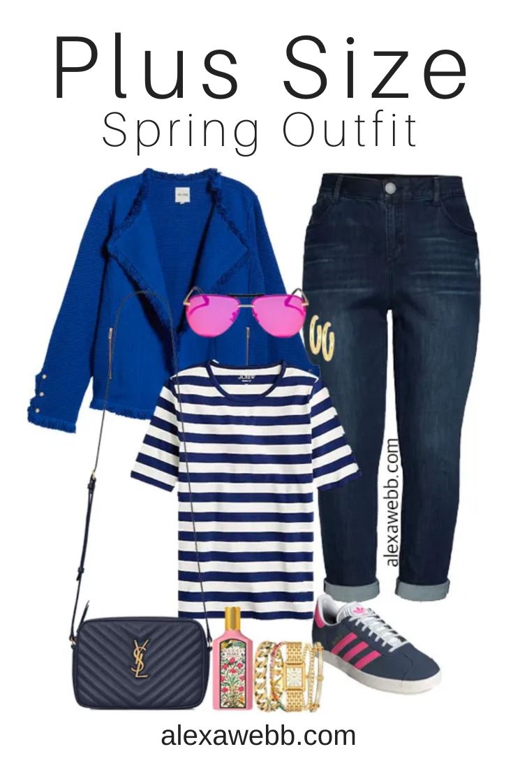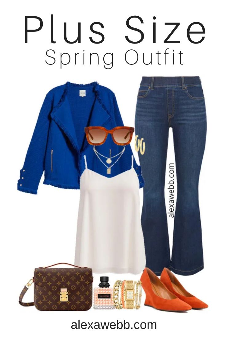 Two plus size bright blue jacket outfits for winter into spring.